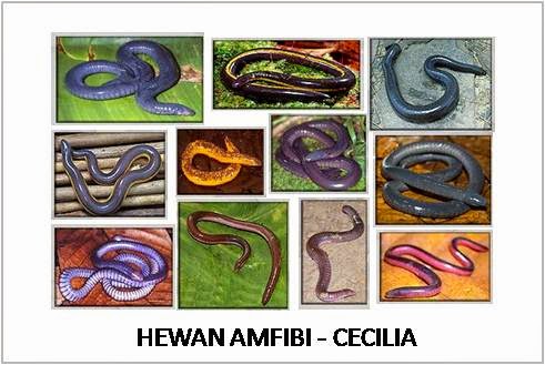 - Cecilia. Merupakan hewan amfibi yang tidak memiliki ekor dan kaki, bentuknya mirip cacing-belut atau ular. Memiliki tekstur kulit yang lembut dan berwarna gelap tidak mengkilap, namun beberapa jenis berwarna-warni. Di dalam kulit ada sisik dari kalsit, memiliki banyak lipatan berbentuk cincin, yang sebagian menutupi tubuhnya sehingga mereka nampak beruas-ruas. Seperti amfibia lain, di kulitnya ada kelenjar yang mensekresikan racun untuk mengusir pemangsa. Cecilia merupakan satu-satunya ordo amfibi yang pembuahannya internal. Cecilia jantan memiliki organ mirip penis, disebut phallodeum, yang dimasukkan ke kloaka betina selama 2 sampai 3 jam. Cecilia menyukai tempat-tempat yang basah atau lembap. Tepi-tepi sungai atau parit, di bawah tumpukan batu, kayu atau serasah yang bertimbun; dan di dekat kolam atau rawa.